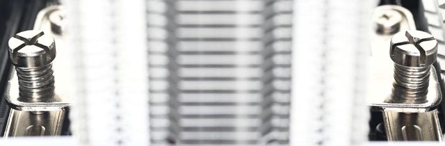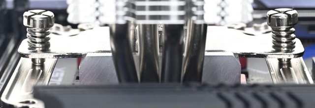 ▼從側面看,壓板兩邊設置鎖在托架上的彈簧螺帽,壓板中間用1個手轉螺絲固定在散熱