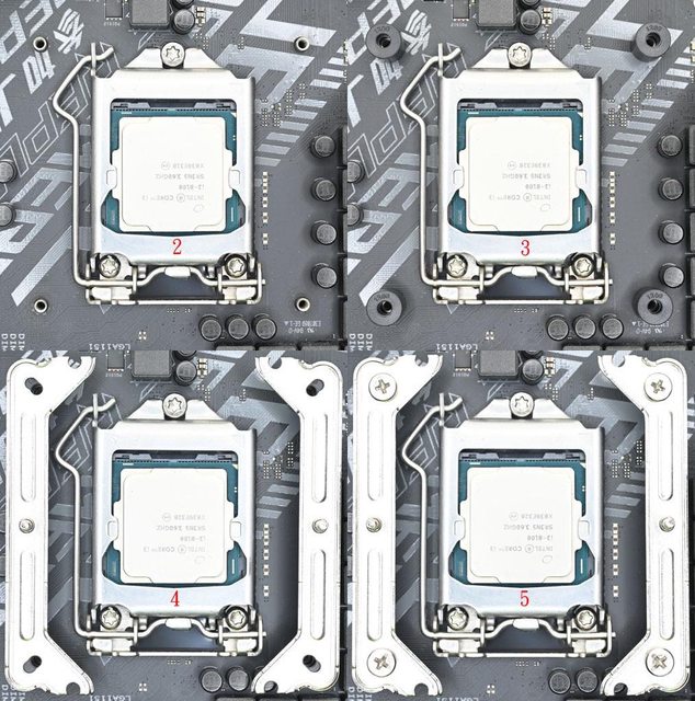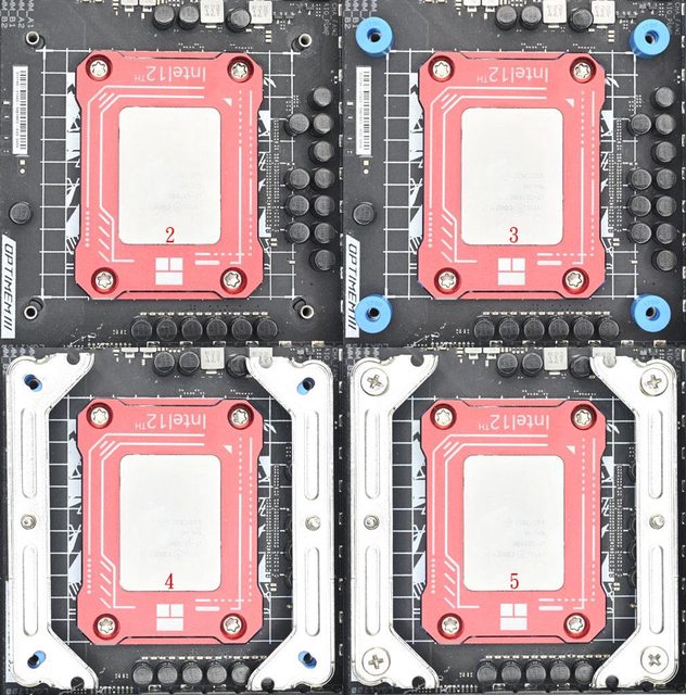 LGA1700藍色套管套上固定鎖點(3),放上托架(4),用4個Intel托架固定螺絲鎖緊(5)