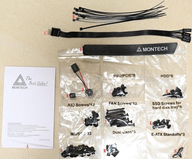 螺絲(G)、托盤3.5吋裝置專用固定螺絲(H)、AIO水冷排螺絲(I)、風扇長螺絲(J)、托盤