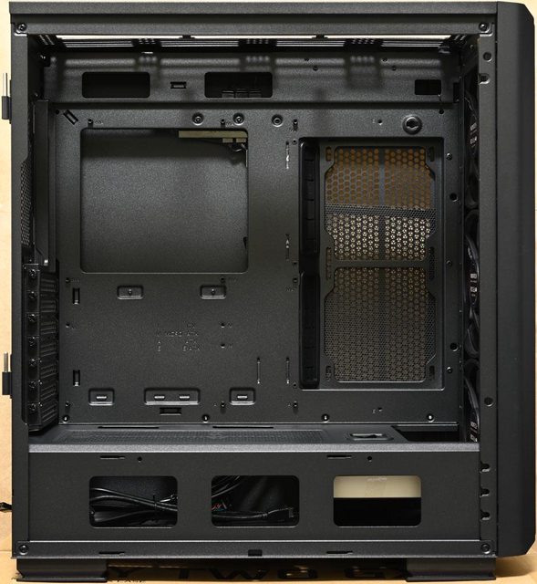 ▼線組撥開以後可清楚看到右側配置,底板中間預裝3條魔鬼氈整線帶