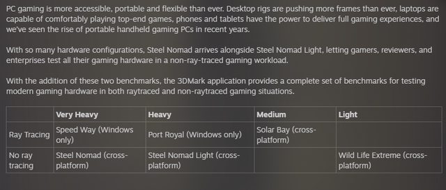 這次推出的Steel Nomad是不包含光追測試的評測工具。UL表示針對光追有其他的跑分工