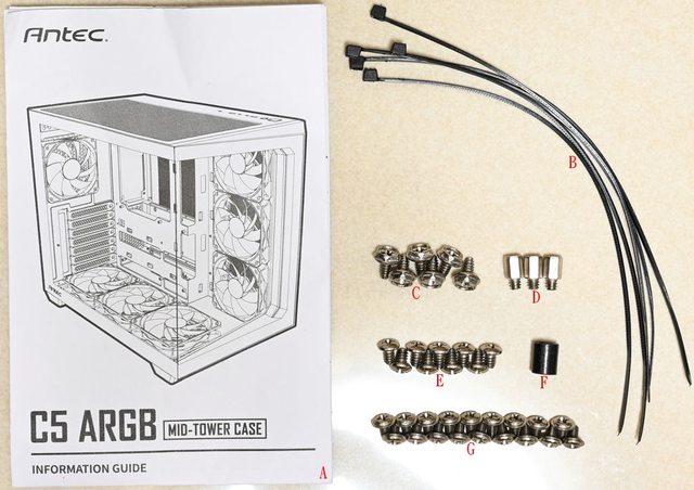 ▼隨附配件有說明書(A)、塑膠束帶(B)、電源/顯示卡螺絲(C)、主機板銅柱(D)、3.5吋裝
