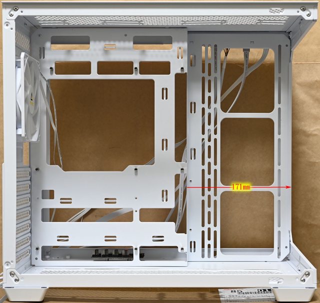 ▼左艙配置圖,底板配置多個背插式主機板後方連接器的大面積開口及穿線開口,開口附