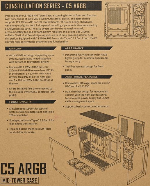 光風扇及1個P12 120mm PWM發光風扇,底部及頂部可裝360mm一體式水冷散熱排,右側前
