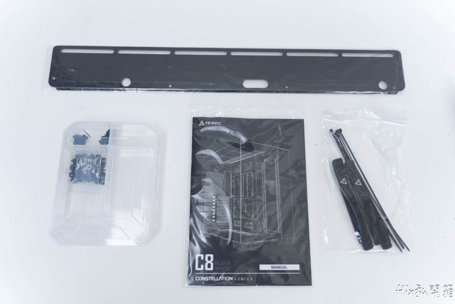 配件盒內放著下置風扇的12cm風扇支架、螺絲盒、束帶及說明書