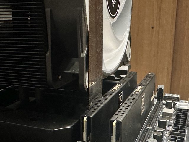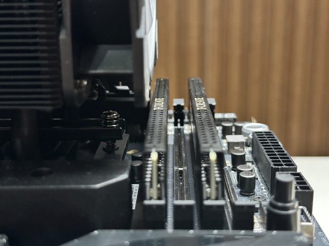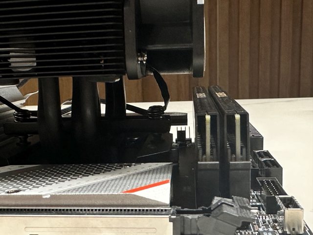 首先以Z790 DDR5 ATX主機板測試,目測風扇已非常貼近第一個記憶體,實際以薄鐵尺測