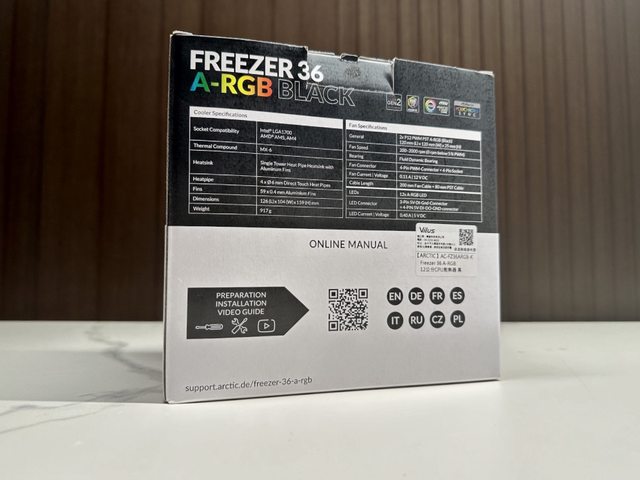 採用深黑色包裝,正面標示Freezer 36 A-RGB Black型號及散熱器輪廓,其中ARGB以醒目