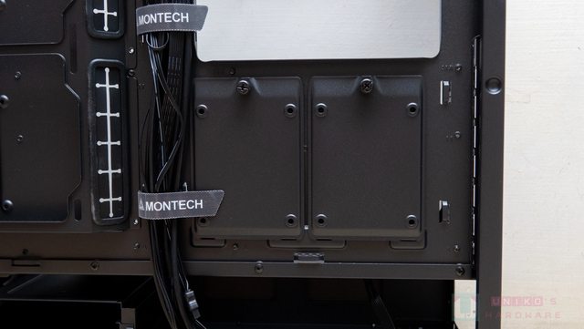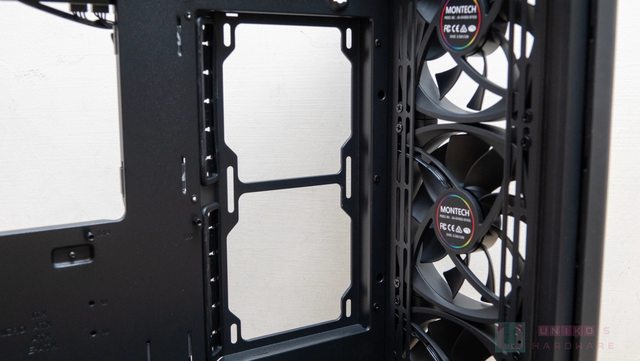 碟架的鎖點,有 2 段位置可以選擇,代表著前方也可以安裝水冷排加風扇。
