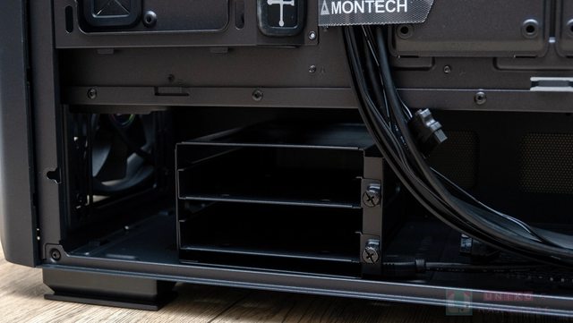 2.5 吋硬碟安裝首先選在背部專用的安裝支架上,下方則是 3.5 吋硬碟優先使用。先前提