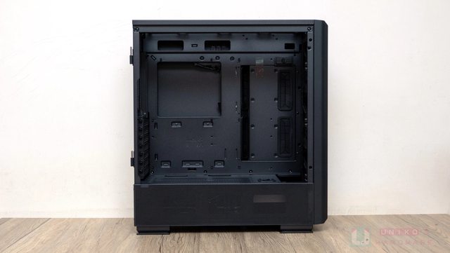 打開側板後內部配置相當清楚明瞭,可看到內建 PWM & ARGB 集線器、側邊風扇框架、線材