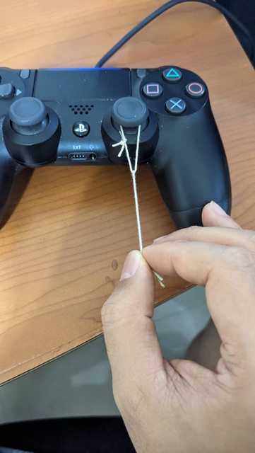 再用另一條棉繩套住那個圈,頭尾捏住往後拉