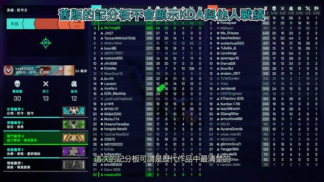 是,這次的記分板可謂是歷代作品中最清楚的,左邊是玩家個人的戰績,右邊則是全場玩