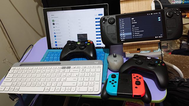 原本的xbox360搖桿、NS拿來代班的JoyCon與藍牙鍵盤滑鼠合照一下
