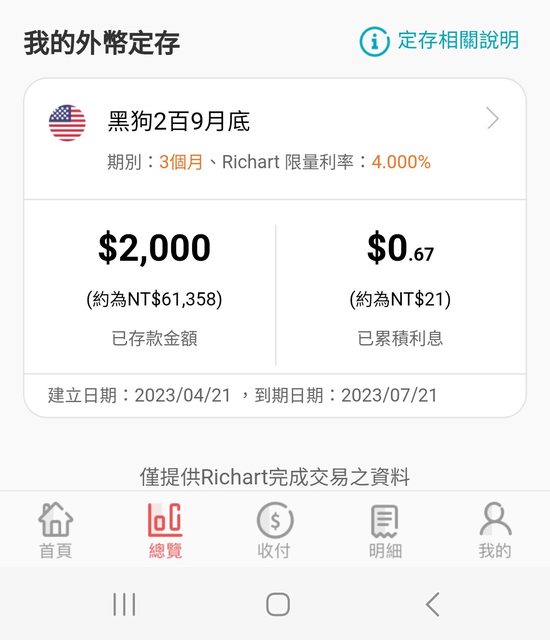 → corlachang : 美金定存要從Richart帳放台幣買,4/1開始的黑狗卡額 04/24 19:01