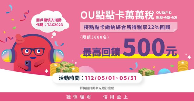 4. 活動內容:符合條件之新戶,以OU點點卡繳納111年綜合所得稅,可享繳稅金額22%現金?