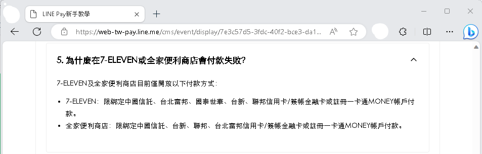 推 smallkuli : 7-11的linepay是有特定合作的信用卡才能刷 07/19 14:44