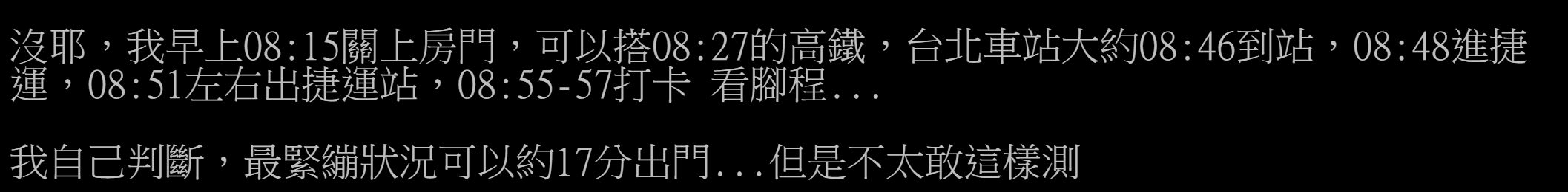 推 muserFW: 樓上那篇這樣算應該是40分鐘 但他捷運那個接軌時間有點 09/21 16:48