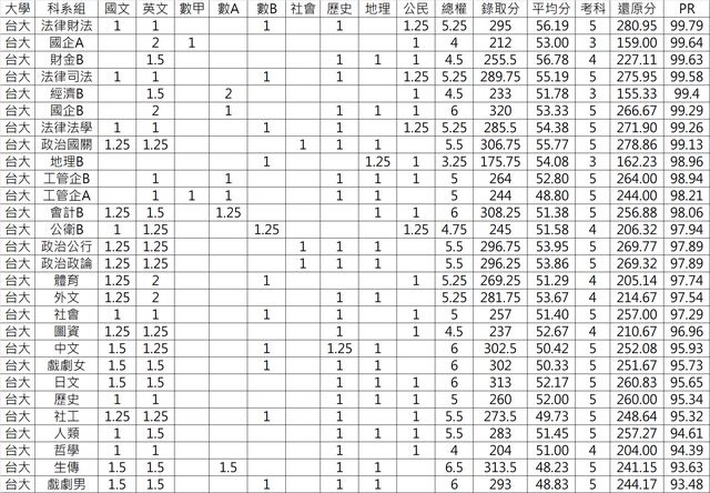 不同的採計組合有不同的級距,對於同樣平均分有不同的PR值