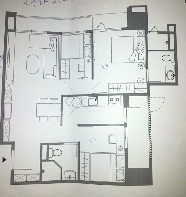 目前看是廁所門對著廚房入口,還有主臥會有一根大樑
