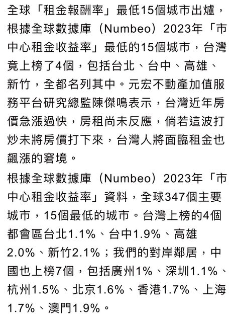 → PTTMAXQQ: 報導都說房租投報率就1%多而已 10/15 15:34