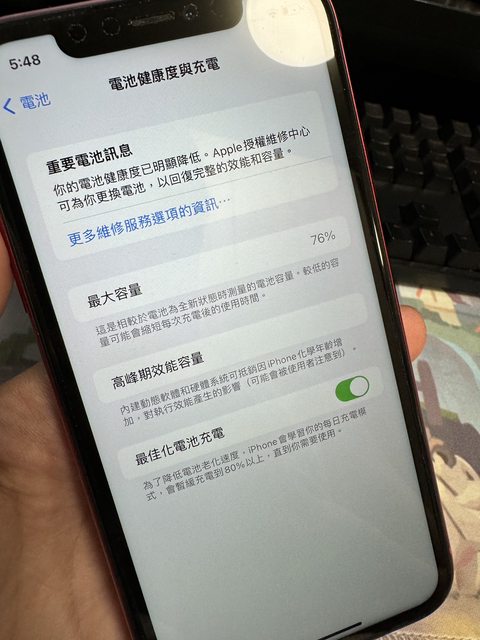 電池健康度 76%,無換過電池,過往未曾有任何異常現象也無送修過。