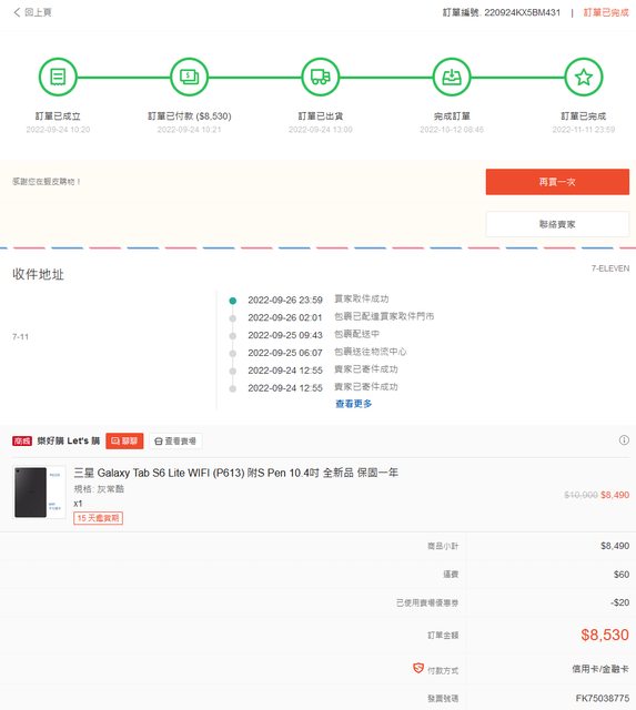 欲售物品:已售 Galaxy Tab S6 Lite 2022 4G/64G (SM-P613) 黑色 已售