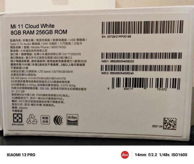 欲售物品:二手 小米11 白 8G/256G盒裝完整