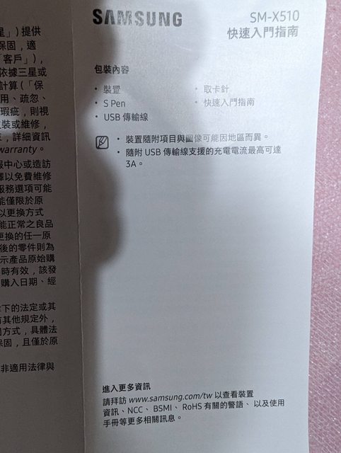 盒裝內含:平板一台,取卡針,S Pen, 快速入門指南,USB傳輸線。