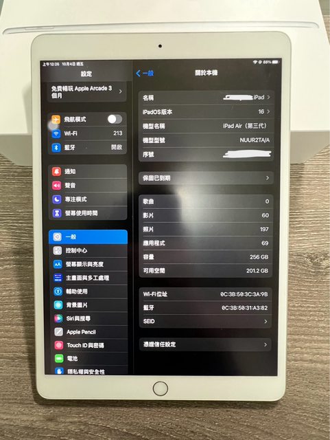 欲售物品:iPad air3 256GB WiFi 白 (送Apple pencil 1)