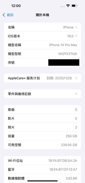 保固日期:保固內 保固至2025/11/28 (有加購AppleCare+)