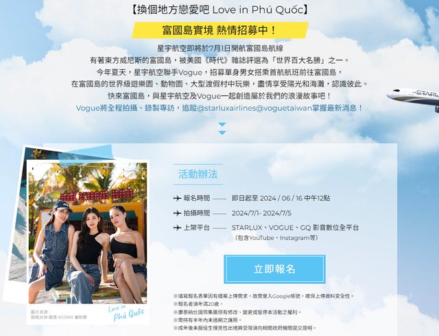 今年夏天,星宇航空聯手Vogue,招募單身男女搭乘首航航班前往富國島,