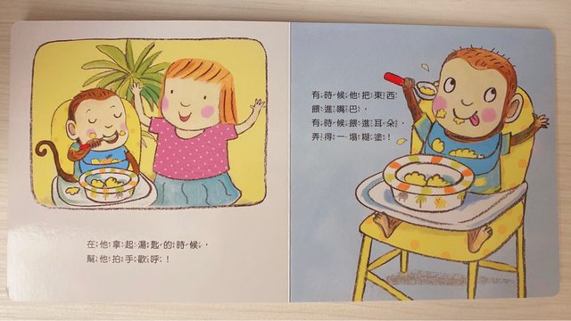 像是吃香蕉這本 把想吃香蕉的小猴子放進娃娃椅、它自己拿起湯匙時幫它拍拍手、擦口