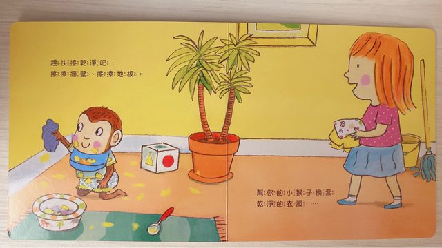 念到現在講到關鍵字時 我女兒會幫小猴子拍拍手 做擦地板的動作 唸到最後再把女兒抱