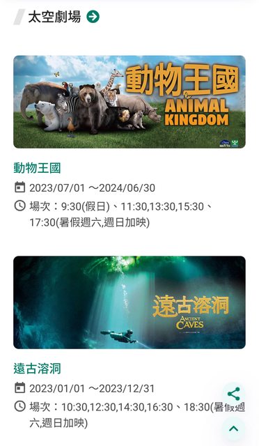 說明:目前展演的為動物王國(38分鐘)和遠古溶洞(41分鐘),需久坐適合2y以上願意