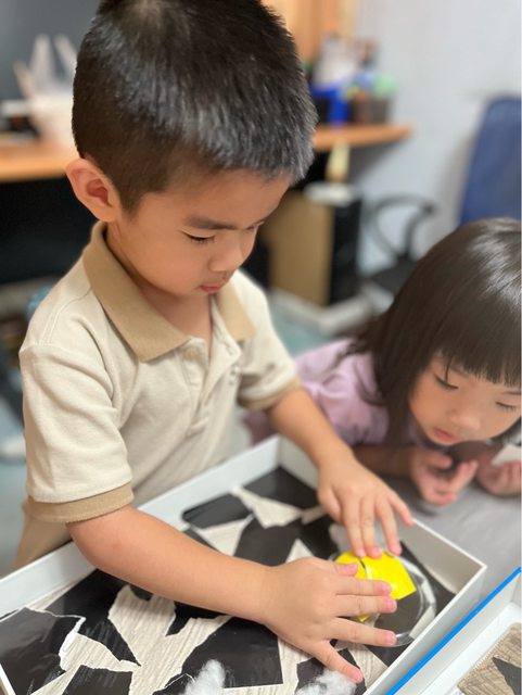 拿出黃色色紙剪成方便黏在月亮的大小,寶貝月齡較小可以用撕的方式進行,將色紙後方