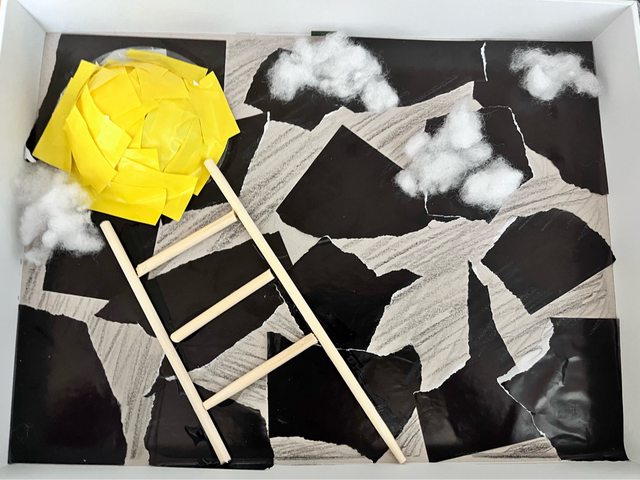 最後將孩子照片剪下,後面貼上布膠,讓孩子把自己的照片貼在梯子上方,作品就完成囉