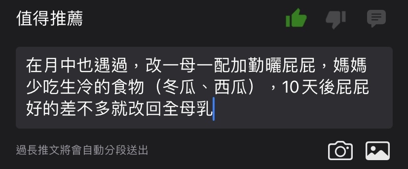 → docir : 方,白天三餐維持母乳。除了水洗屁股外,白天要勤 09/21 07:54