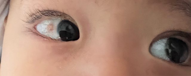 : 中午回家後發現有一眼紅紅的,問婆婆她也沒注意到,說可能是他想睡自己揉的
