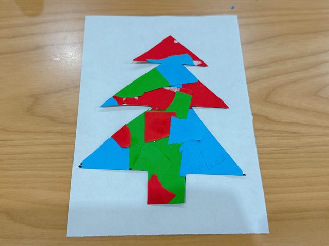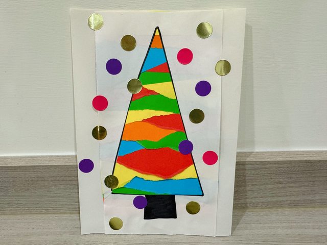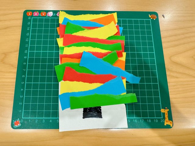 在聖誕樹中間貼上撕或剪下的色紙