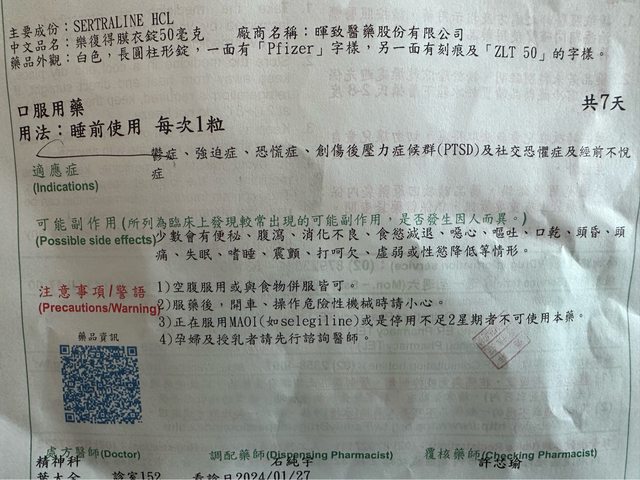 推 x65784000 : 本身是精神科護理師,很少聽病人說吃Zoloft會盜汗, 01/28 21:40