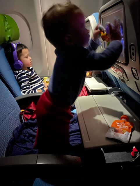 最遠端有另外一名乘客,所以大寶吃完機上餐後就去旁邊空位睡覺了;小寶這段航程醒著