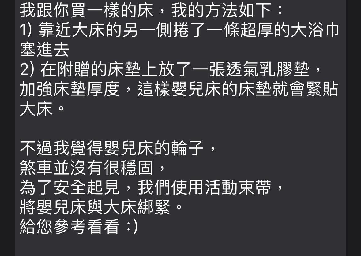 推 sweetftt : 嬰兒床併大床都會有吧,床墊靠大床另一邊縫隙塞浴巾 03/11 23:54