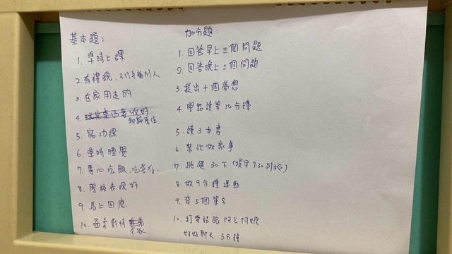 補充:基本題跟加分題限縮只能十項,避免因繁法導致反效果。在訂定時便會孩子說明基