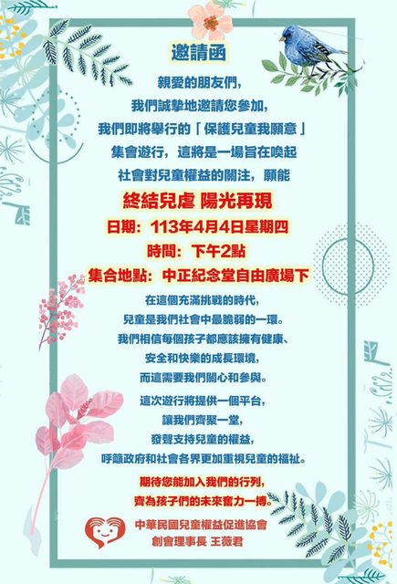 因為還沒有新聞幫忙活動宣傳, 不知道還有多少家長關注剴剴案(兒虐)議題。 我兒子跟剴剴一樣都是虎寶寶,1歲半的孩子牙牙學語真的好可愛,我不禁想問上帝, 剴剴是如此純淨幼小的靈魂, 為何要讓他遭受這麽巨大的苦難? 剴剴,阿姨能為你做些什麼呢? 除了不要忘記你,4/4兒童節要去台北市的中正紀念堂,支持守護兒童的活動,一起呼籲 每個大人重視關心台灣每一個小朋友。 剴剴親友提供大頭照模板網頁如下: https://twb.nz/justiceforkaikai 希望支持4/4護兒活動的朋友們能套上濾鏡的照片做大頭照,幫忙宣傳讓更多人能看到並 重視台灣受虐兒童。 護兒活動發起人是受虐兒王昊的姑姑王薇君FB如下 https://www.facebook.com/share/p/XqeFnEMbBfaKjcvg/?mibextid=qi2Omg 剴剴親友紀念剴剴的FB如下 https://www.facebook.com/profile.php?id=61557363928459&mibextid=ZbWKwL 馬太福音 10:26 所以不要怕他們,因為掩蓋的事沒有不露出來的,隱藏的事沒有不被人知道的。 不能讓每位受虐兒及剴剴的血白流,希望這次大家4/4一起上街頭!! 願每個孩子都能被好好善待, 好好長大成為一位良善的大人! https://i.imgur.com/PWeDhT5.jpg