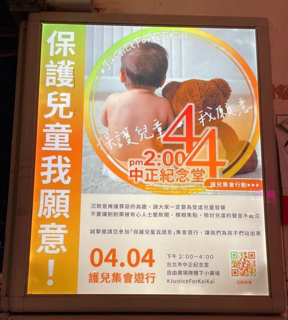 還記得那個傷痕累累的幼小身軀嗎? 他的逝去讓我們充滿遺憾 但別忘了 這世上還有許多身處相似環境的孩子 等待著我們的擁抱 金恩博士曾說: 「社會最大的悲劇 不是壞人的囂張,而是好人的沈默。」 剴剴已無法發聲 但我們可以站出來,為他訴說夢想 訴說一個他不能再有的夢想 但能給予其他孩子更多的可能 願每個孩子都能平安長大 4/4 下午兩點,中正紀念堂自由廣場 見 https://i.imgur.com/MFpIgks.jpg