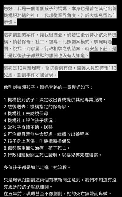 不知有沒有家長跟我一樣, 每天刷著剴剴的照片和新聞, 希望傷害剴剴的惡魔都能判重刑, 希望加害者兒福聯盟能被嚴懲。 如果有來生,大家都希望剴剴能當自己的小孩,把這輩子欠他的愛加倍還他。 如果時光能倒流,大家都希望自己是社工, 能夠即時把剴剴拯救出來。。。 https://i.imgur.com/OFLrYGL.jpg