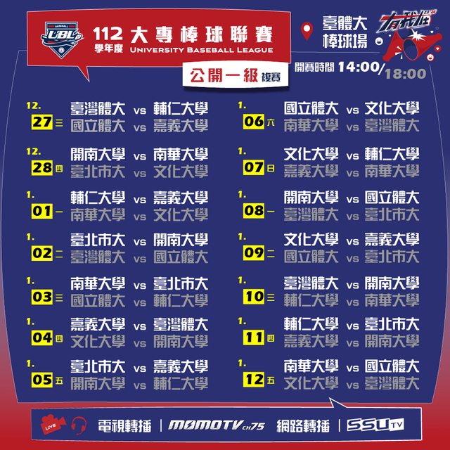 標題[LIVE] 112年大專棒球聯賽公開一級 12/27複賽