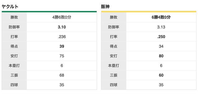 阪神 6 勝,養樂多 4 勝