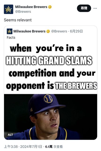這一轟也讓釀酒人本季6發GS成為MLB最多