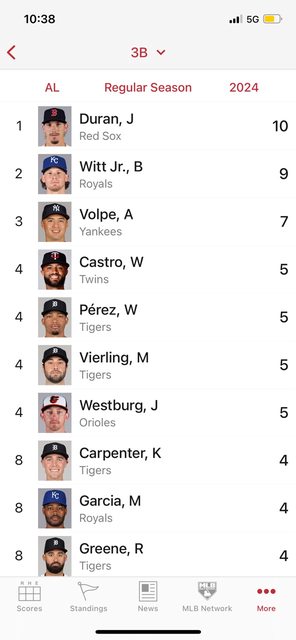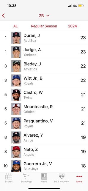 此外他目前二三壘打的支數都暫時名列美聯第一